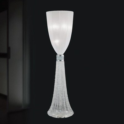 19498-010 Features: -Six light floor lamp. -Gregorio collection. -Chrome finish. -White shades. -The chrome stand is cloaked behind an elegant tapestry of draped crystal beads. -Soft lumination whispers tranquility, emanating from behind a sheer ivory l Ampshade. -The curved architecture is drawn in centrally by silver bands and embedded crystal. Specifications: -Accommodates (6) 60W E12 base B10 bulbs. -Overall dimensions: 74'' H x 0.1'' W x 20'' D. -120 Volts..../ Gregorio Six Light Floor Lamp in Chrome / Eurofase